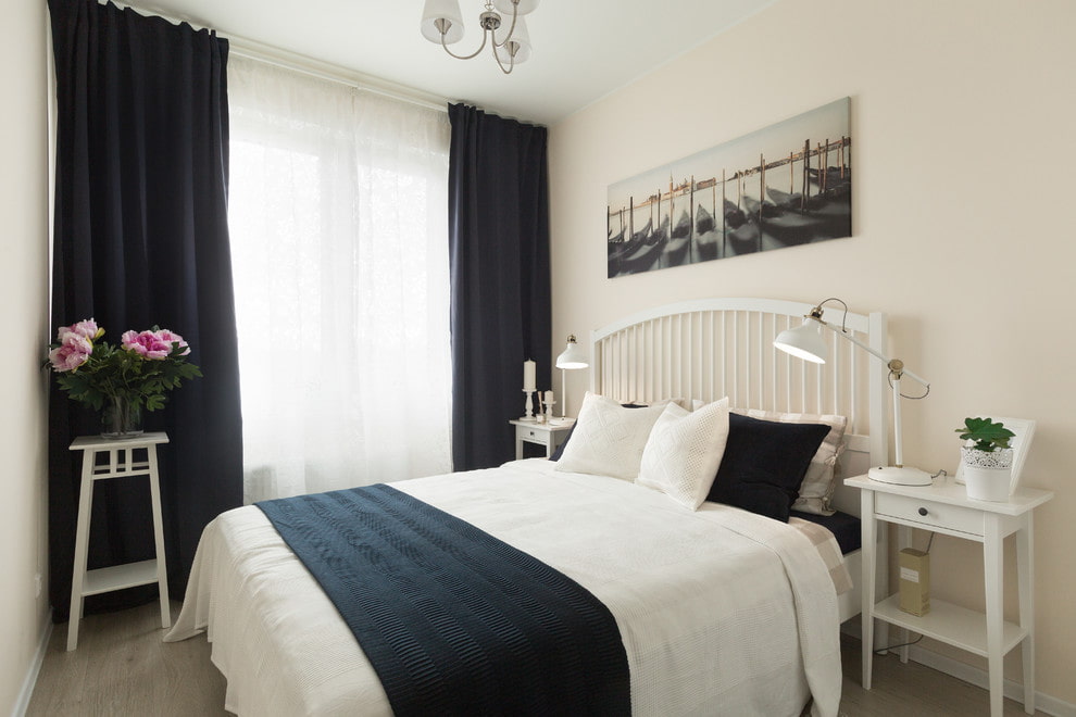 When choosing curtains, preference is given to canvases made of light, light fabric. In the interior of a small bedroom in Khrushchev, the use of heavy curtains with a lot of draperies and lambrequins is not appropriate. The best solution would be plain curtains without flashy ornaments.