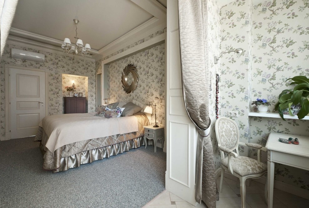 The design of a room with a boudoir is popular, where it will be convenient for a woman to place all the necessary cosmetics and put herself in order. In this case, the bed will organically fit into the bedroom, and a chest of drawers, mirrors or dressing table will fit in the form of a zoning element.