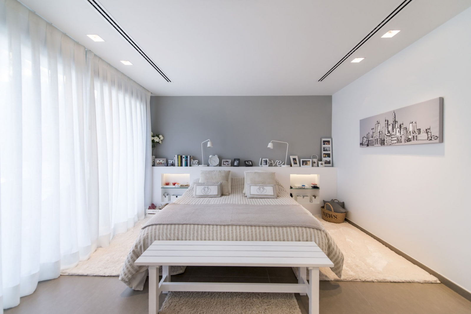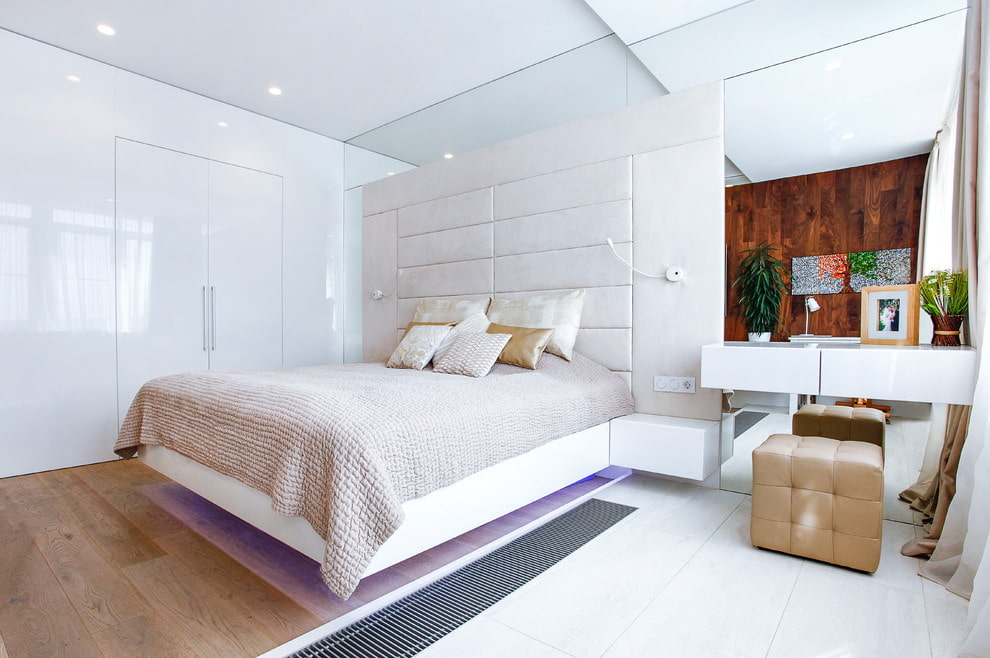 White means always hitting the target. But a completely white bedroom in a modern style looks impersonal. If you choose this color for decoration, complement it with colored decor.