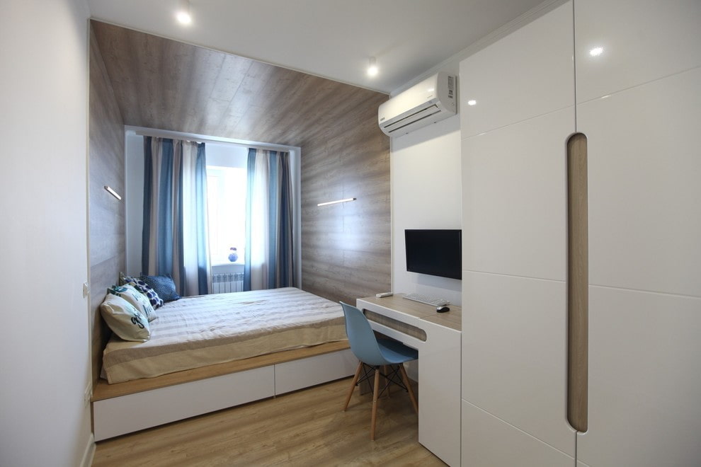 If the area does not allow placing a sleeping place and a large wardrobe, combine them. Drawers under the bed are used for storing bed and off-season clothes, pencil cases on the sides of the bed are suitable as the main wardrobe system. If you hang a narrow elongated wardrobe between them, the bed will be in a niche, and there will be more storage space.