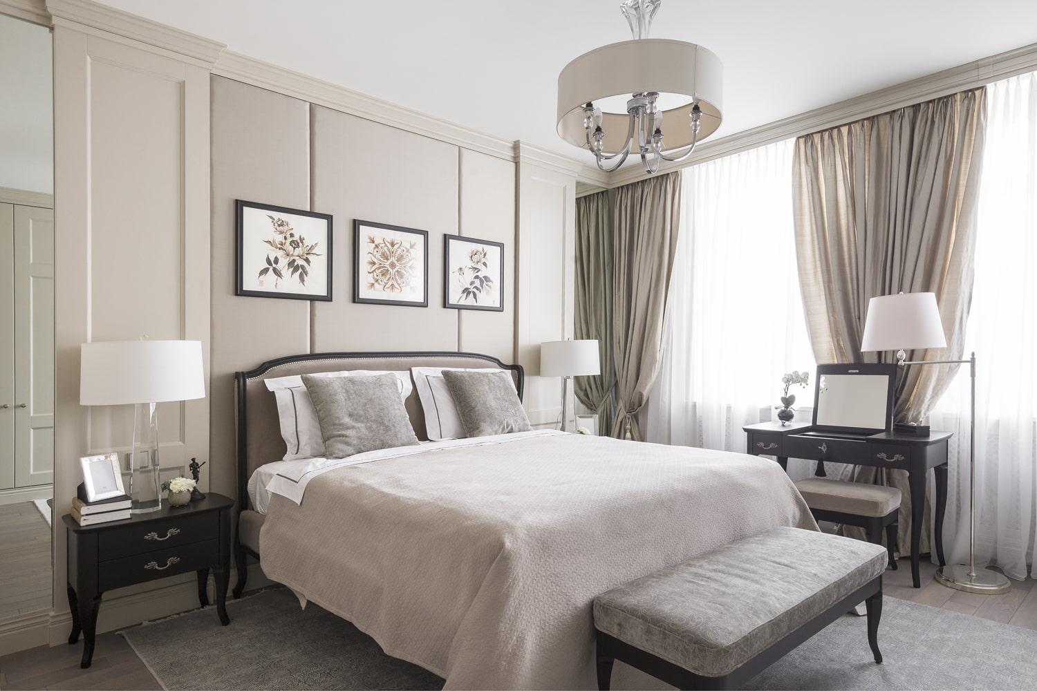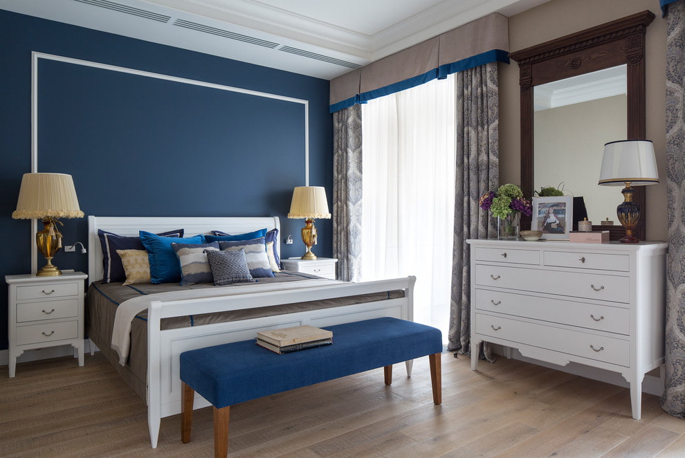 The arrangement always starts from large to small. Find the right place first. bed - it is better to install it with the headboard to the wall, leaving free passages of at least 60 cm on each side. So it will be convenient for any person to move around and you can easily find suitable bedside tables.