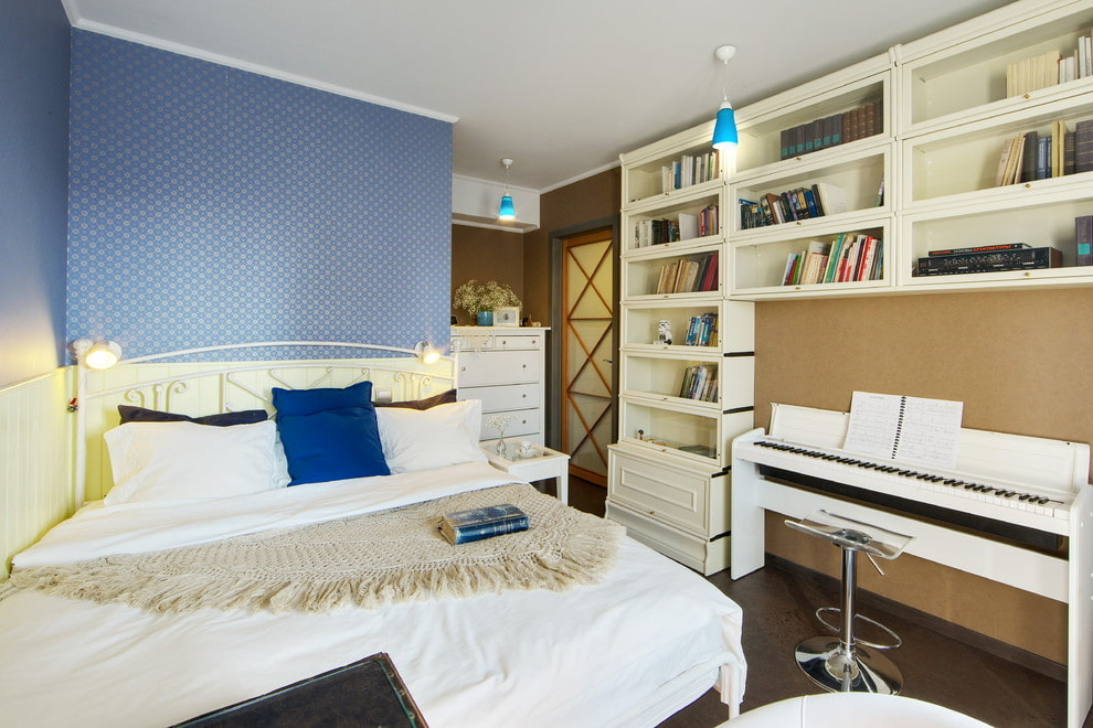 In a narrow bedroom, thanks to the competent separation of curtains, screens, glass showcases or other furniture, it is possible to simultaneously equip a comfortable place to sleep, an office and even a small living room.