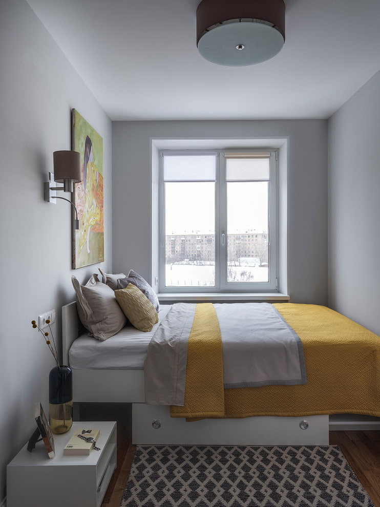 If the room is so narrow and small that only one sleeping bed can be placed in it, it is better to place it in the farthest corner. Such a solution is quite convenient and allows you to occupy the adjacent corner space with a table, cabinet or chest of drawers.
