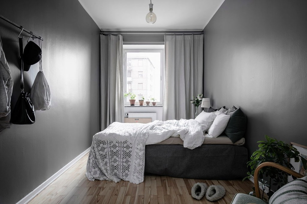 You can put a bed in a narrow bedroom parallel to the elongated walls, so the room will acquire an almost perfect square shape. It is important that the sleeping place can be freely approached from both sides. Otherwise, it will be extremely inconvenient to make the bed or place bedside tables next to the bed.