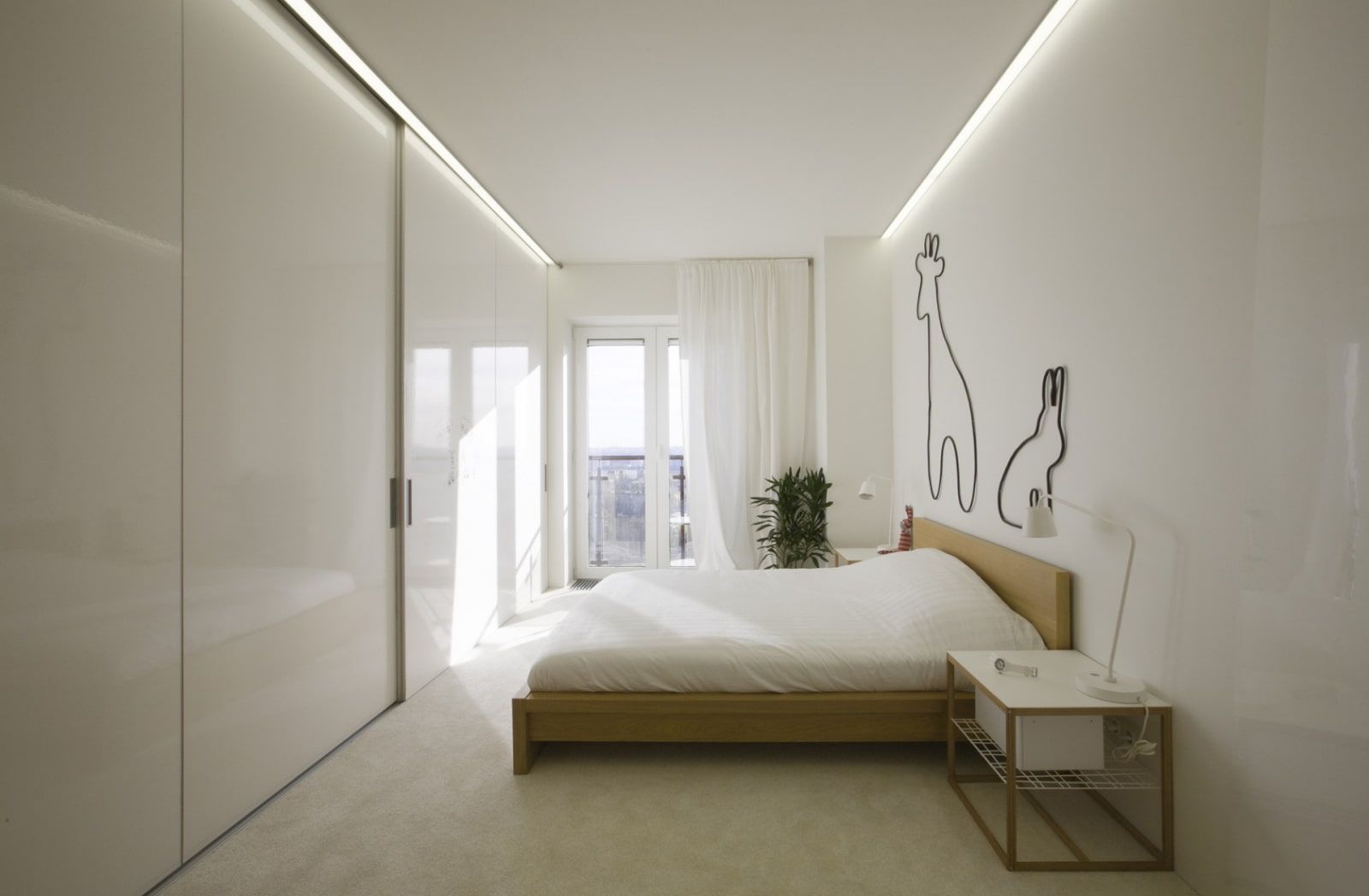 In the photo, the interior design of a white narrow bedroom in the style of minimalism.