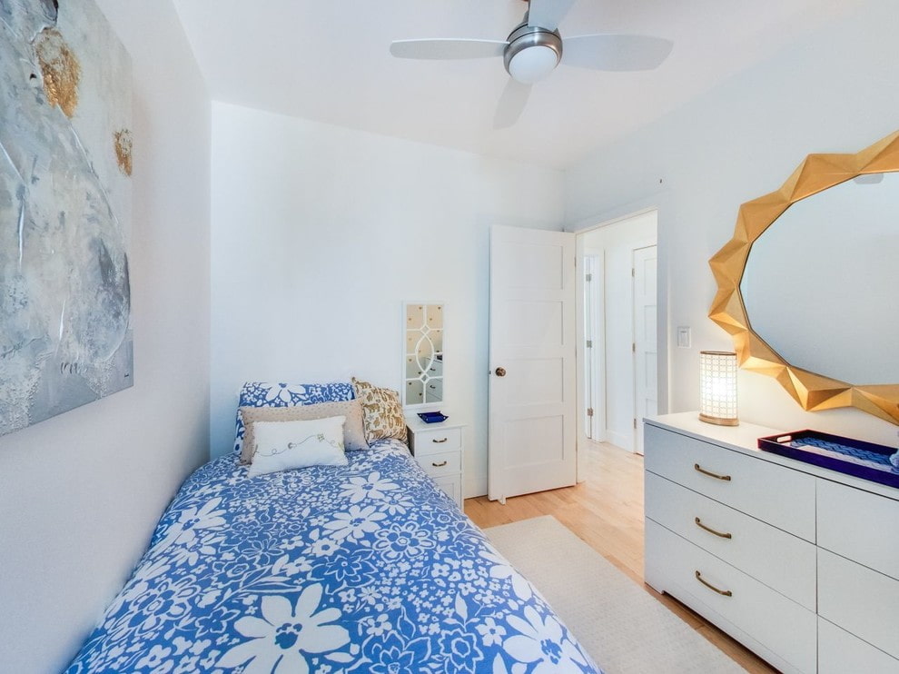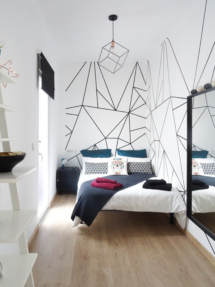 You can visually expand a narrow bedroom with a large mirror, which is mainly placed on the wall behind the head of the bed. Elongated rectangular mirror canvases will look advantageous on a long wall. They will help add perspective to a cramped room and visually break the plane of the wall into pieces.