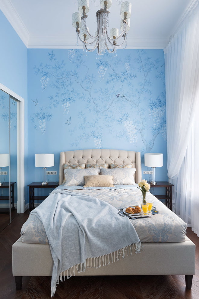 To visually expand the bedroom, use wallpaper with horizontal ornaments or wallpaper with landscape or panoramic images.