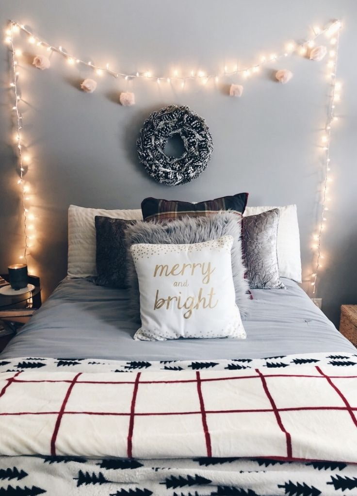 An interesting accent that creates a festive mood, and in the dark - giving a feeling of romance. It is better to use cold bulbs as a neutral backlight, and warm bulbs for a more cozy atmosphere. Garlands look even more elegant, on the wires of which photographs are suspended with the help of clothespins.