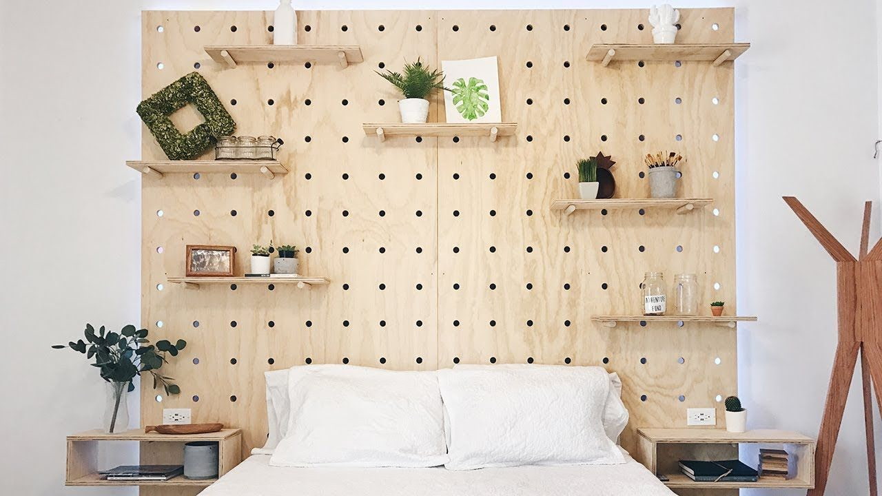 Perforated boards are often used as a storage system, and if earlier they could be found in garages, today they are a fashionable detail in designer apartments. In the bedroom, it is recommended to use a board made of MDF or plywood: it can be painted in any suitable color, equipped with shelves, hooks and rails.