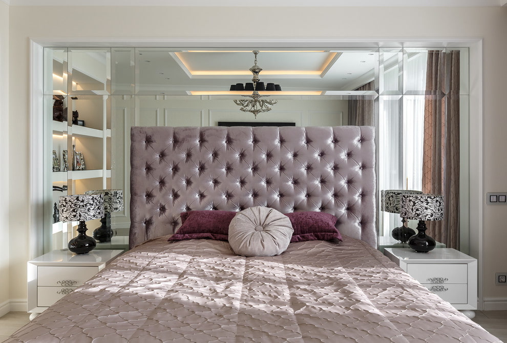 The mirrored ceiling surface will undoubtedly become a bright and unusual decor for any bedroom. This arrangement gives the setting additional aesthetics, and due to the refraction and reflection of light, it makes it unnecessary to install a large number of lighting fixtures in the room.