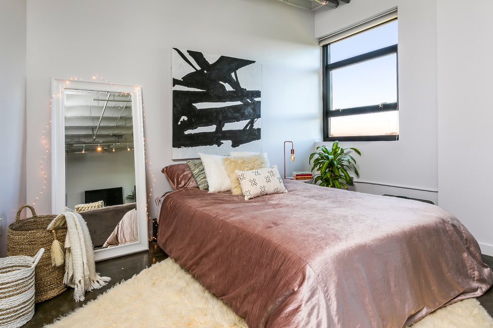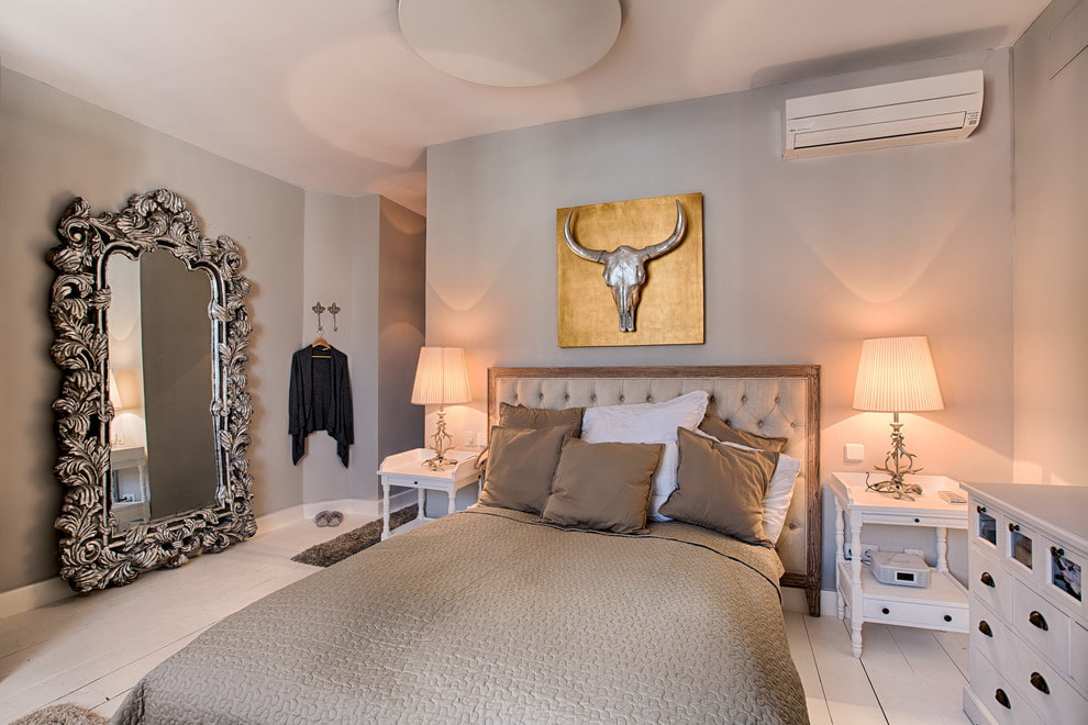 The photo shows a modern bedroom with a floor mirror, decorated with a massive patterned frame in a silver shade.