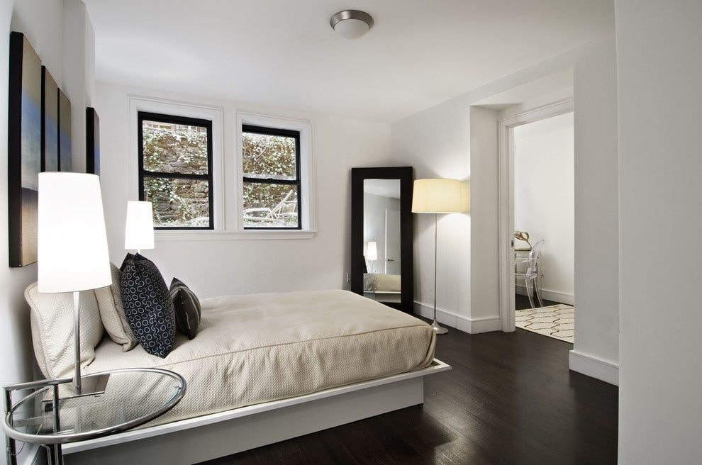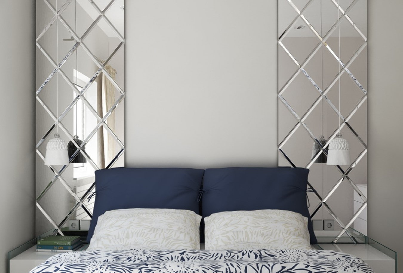 In the photo there are rectangular floor mirrors located opposite the window opening in the interior of the bedroom.