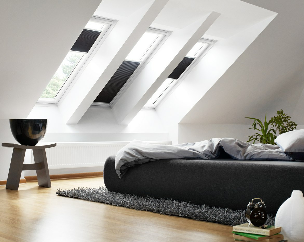 On the picture bedroom with attic and pleated curtains in blackout style.