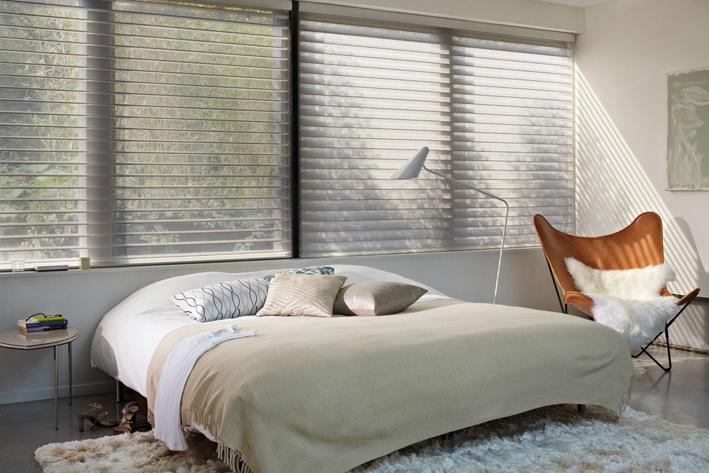 One of the most popular styles today. Aluminum or wooden blinds can be used in window decoration. Metal slats will perfectly fit into a loft-style bedroom interior.