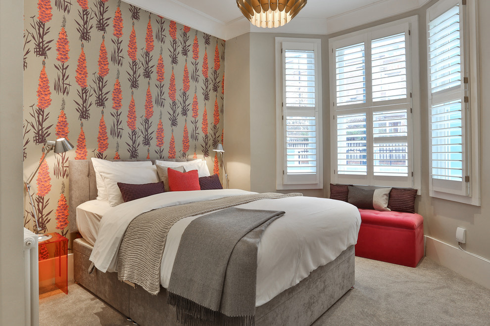 With the help of red blinds, you can put a bright accent in the bedroom. But such an experiment will not look very good in a small, cramped or dark room.