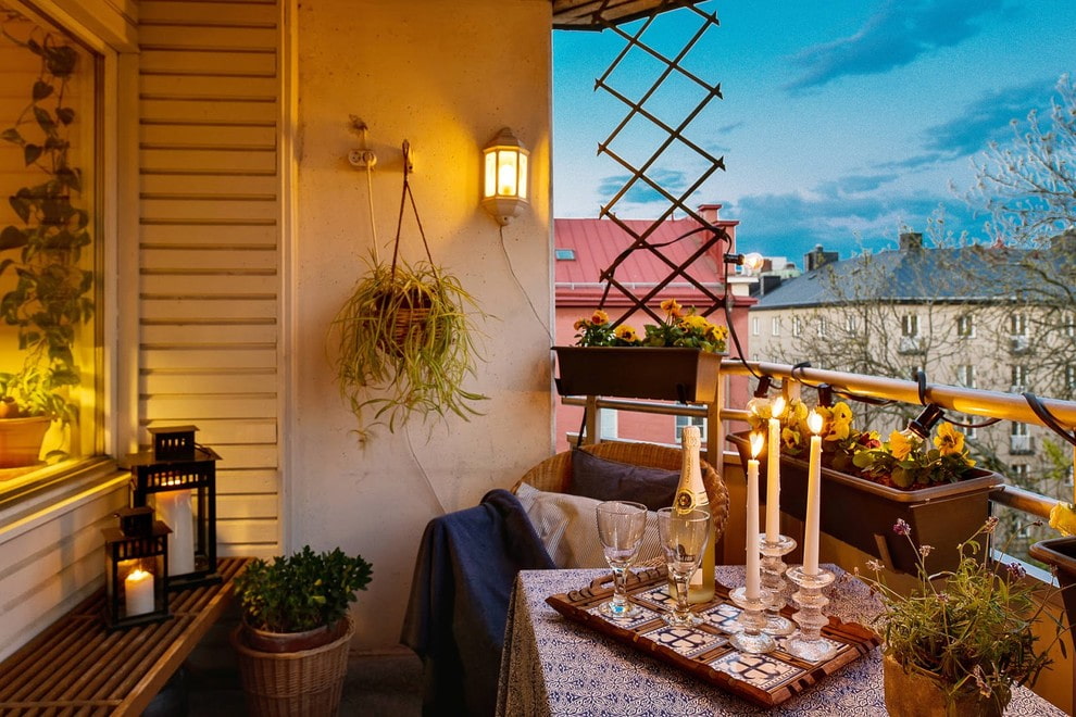 It would be appropriate to decorate the railing on the balcony with an ordinary garland and complement the lighting design with the help of candles or hanging lanterns.