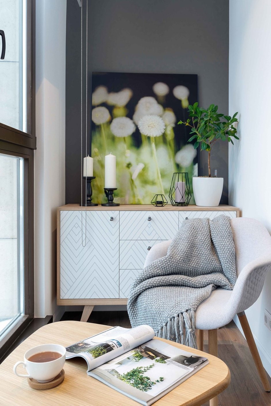 High-quality lighting will allow you to spend cozy evenings on the balcony.The light source will be a small table lamp or floor lamp. The ideal solution for a Scandinavian-style loggia will be dim ceiling lighting.