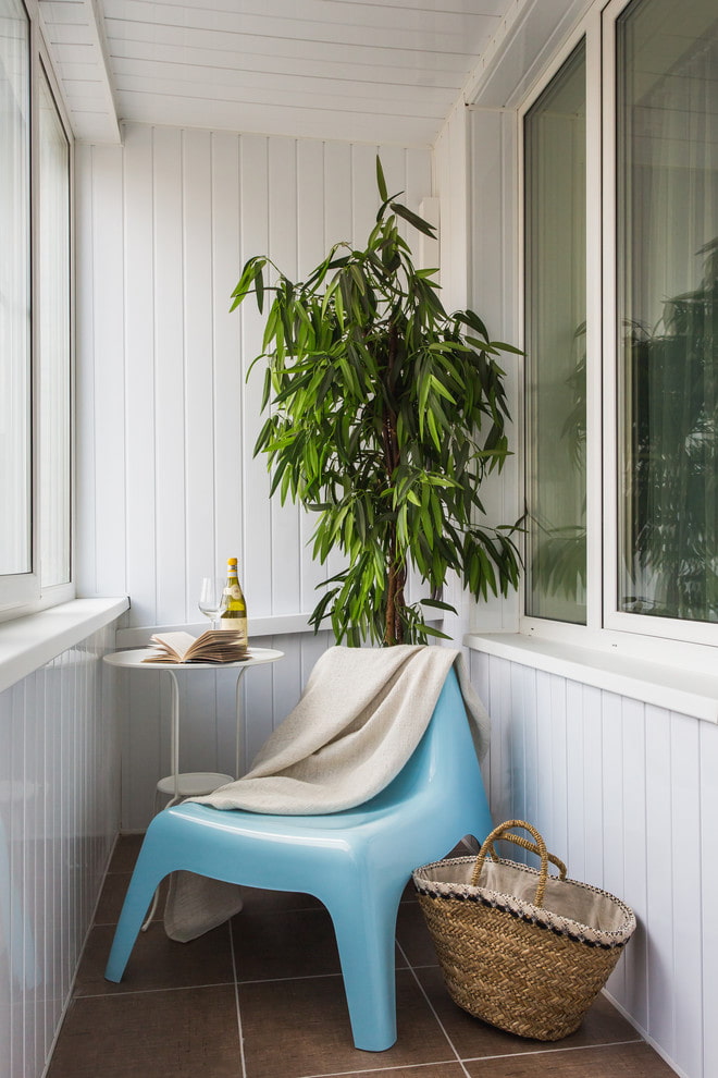 The photo shows the furnishing of the loggia in the Scandinavian style in the interior of the apartment.