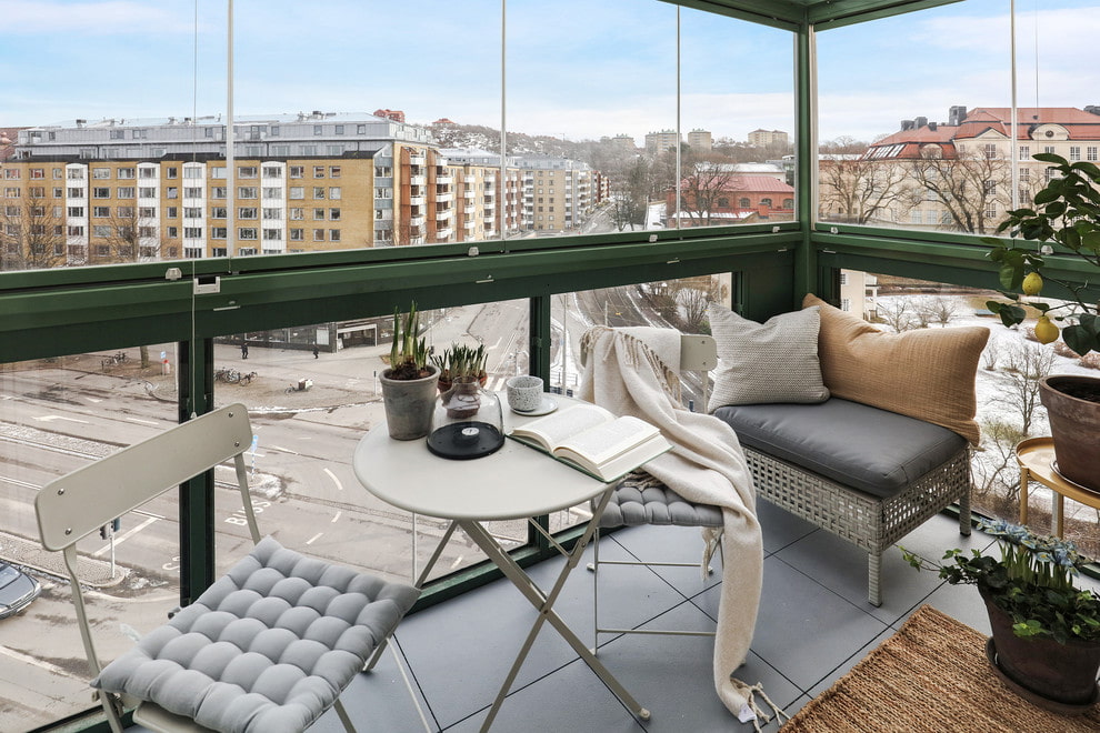 The loggia is decorated with a variety of soft pillows, capes and blankets, allowing you to warm up on cool evenings. To maintain the northern style, the furnishings are decorated with a small rug, natural or artificial skin.