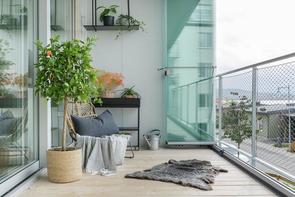 The photo shows the arrangement of a small open balcony in the Scandinavian style.