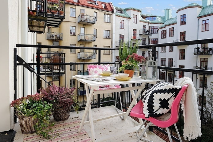 A small Scandinavian-style balcony offers a minimum of furniture and maximum space. It will be enough to install a compact table, comfortable armchairs or chairs here.