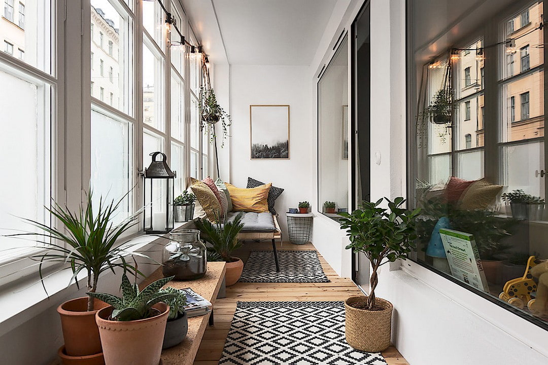The photo shows potted plants in the interior of the balcony in the Scandinavian style.