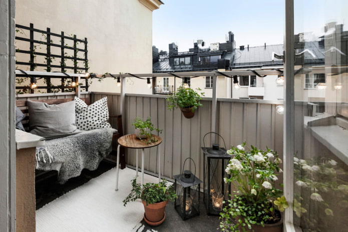 The photo shows decorative lighting of a small open balcony in the Scandinavian style.