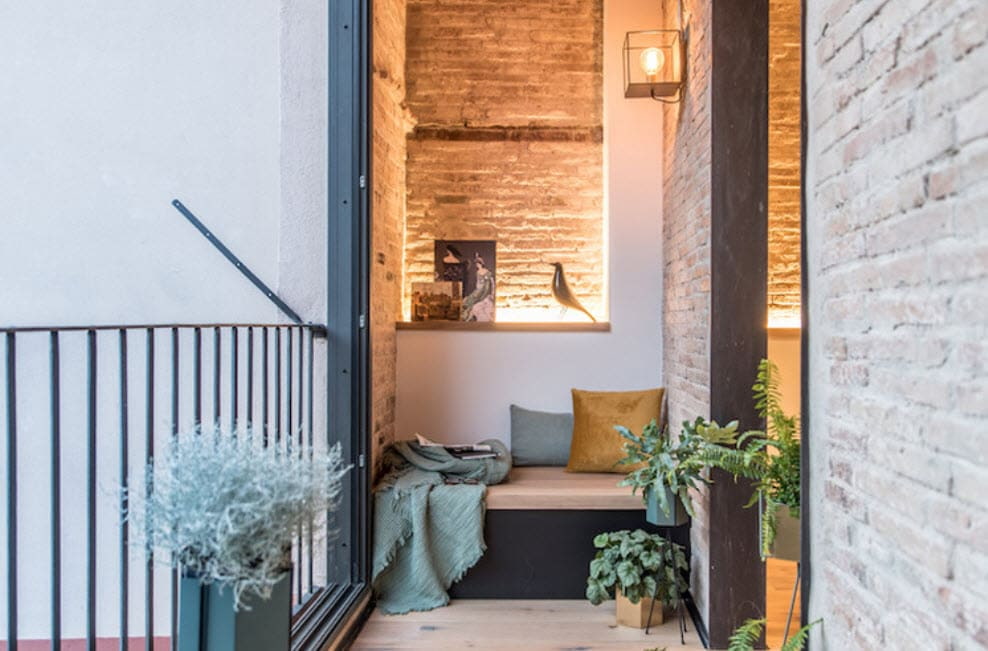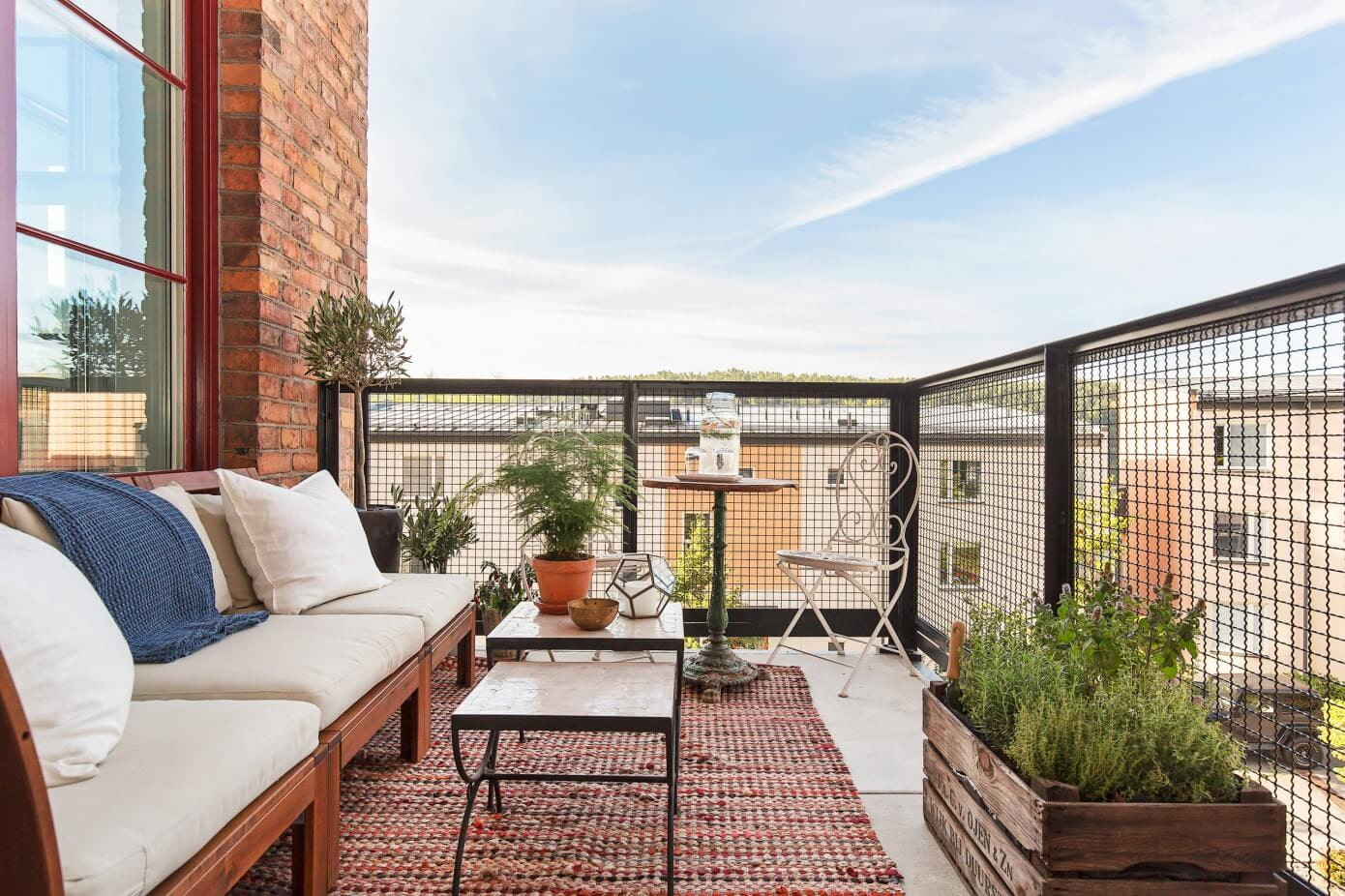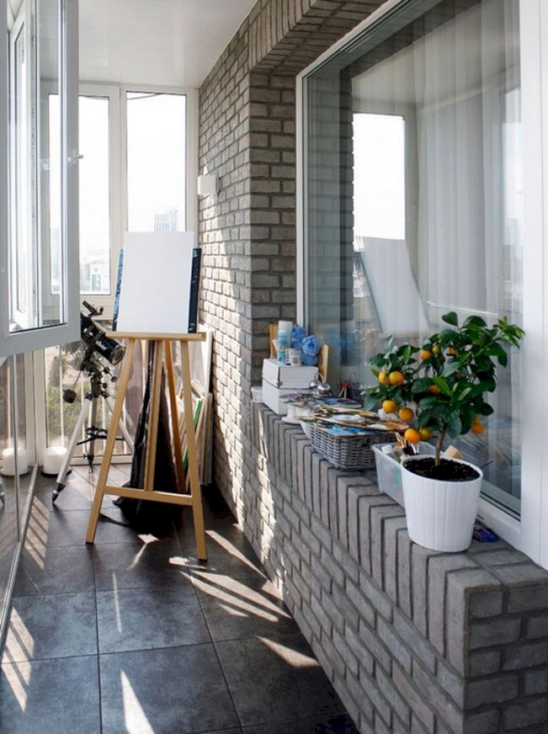 During the warmer months, the open balcony becomes one of the most popular places in the house. Here you can arrange a garden, playing on the contrast of living plants and textures of brick and concrete. To organize a recreation area, it is better to use moisture-resistant furniture designed for the street.