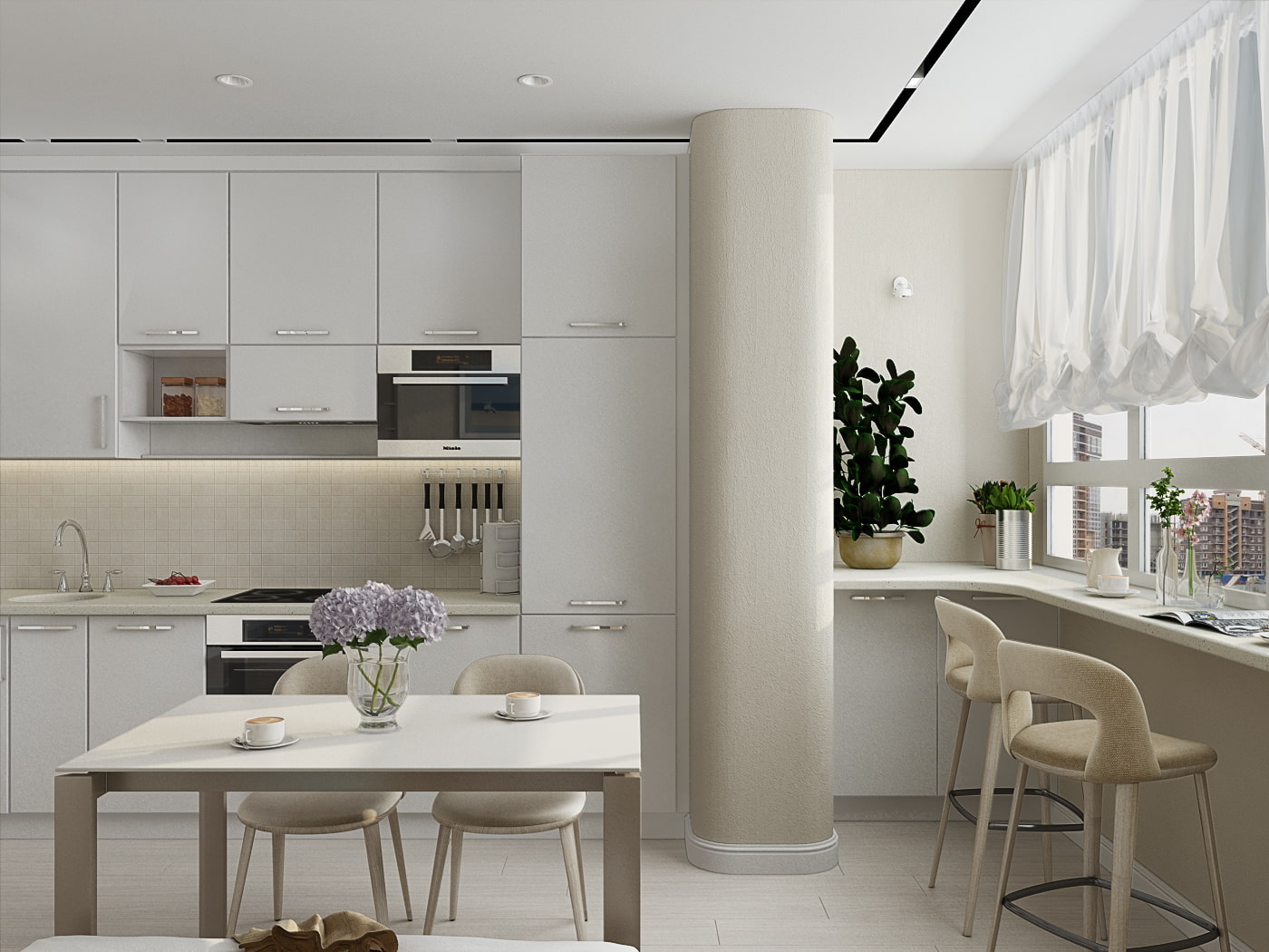 If the apartment does not have enough space for a bar counter, install it by the window on the loggia. The shape can be either straight or with rounded corners.The angular design will increase the number of seats.