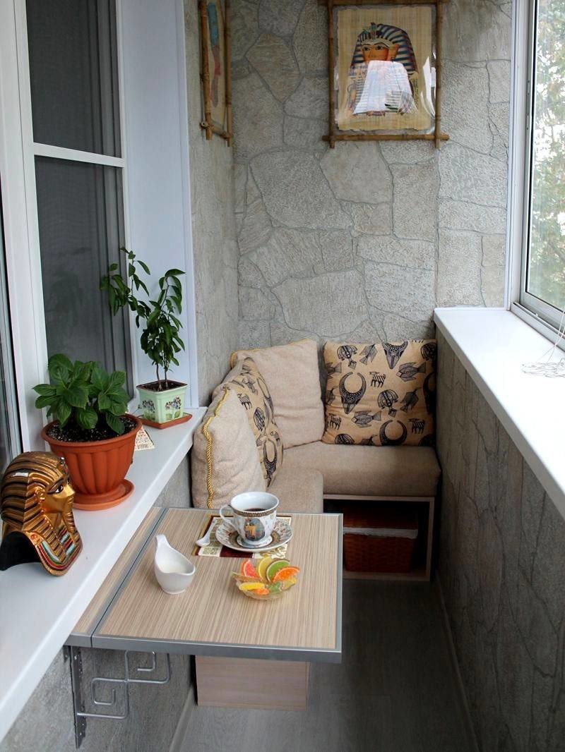 The third important element of the interior is the table. Putting a cup with a fragrant drink, putting a book, phone or work laptop - it will definitely come in handy. In a square loggia, you can make a wide window sill, which will simultaneously replace a table and a shelf for something you need (for example, indoor flowers).