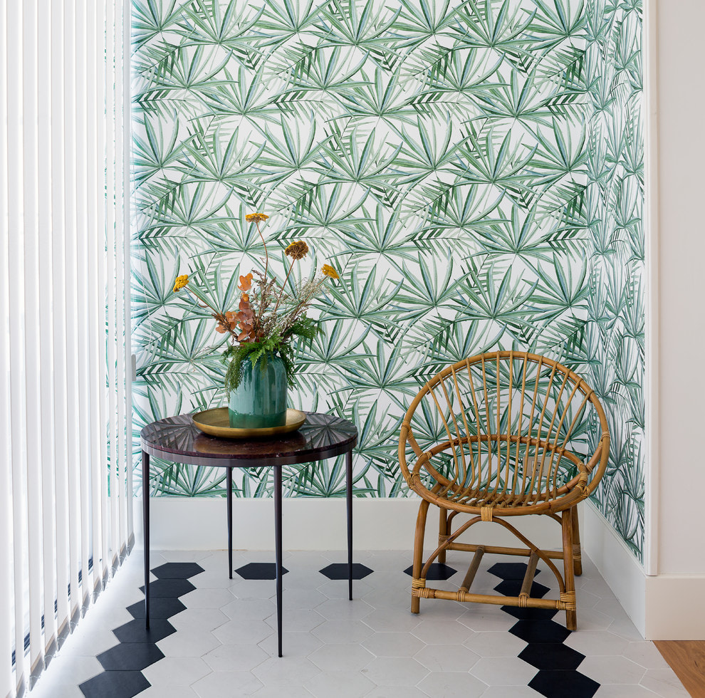 On the picture balcony with partial wall decor with bamboo wallpaper.