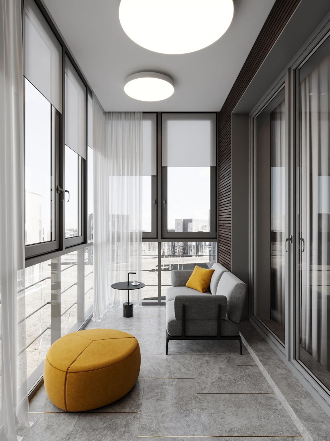 Use the panoramic balcony for its intended purpose: transform it from a poorly organized warehouse into a cozy nest, designed to relax after a hard day and admire the view from many windows.