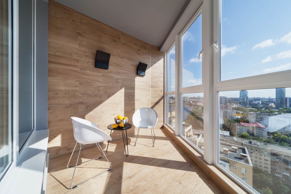 In the photo there is a spacious loggia with floor and walls, faced with wood-effect tiles.