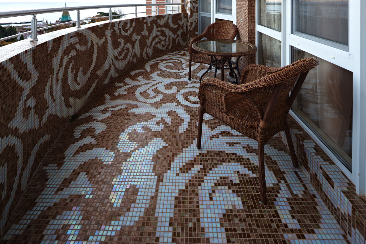 A tile covering for a laminate or parquet, most often has a rectangular shape, which makes it possible to create a design that is as similar to these coatings as possible, patchwork-style products, externally similar to a motley patchwork multi-colored blanket, with the help of this design it turns out to fill the space with a riot of colors and give it a positive energy. With the use of mosaics, you can add a stylish twist to the interior of the loggia and give it an expensive look.