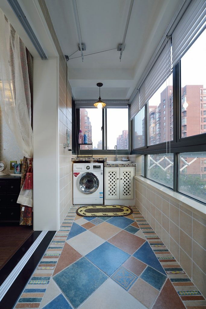 The photo shows a small glazed balcony with patchwork floor tiles.