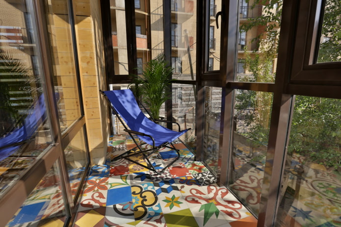 The photo shows the floor on the loggia, tiled with multi-colored square tiles.