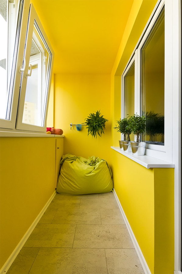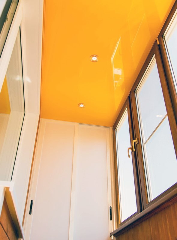 In the photo there is a loggia with a ceiling painted in yellow.