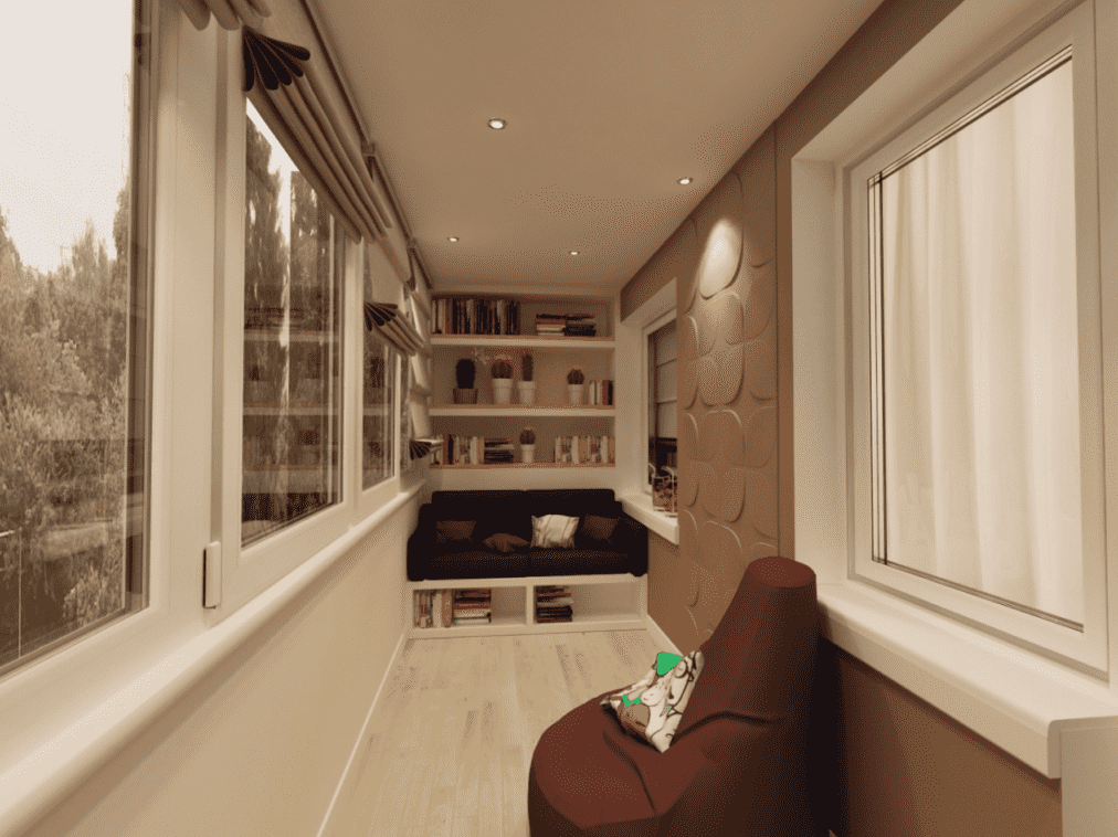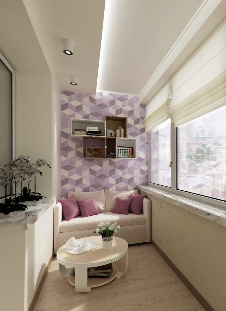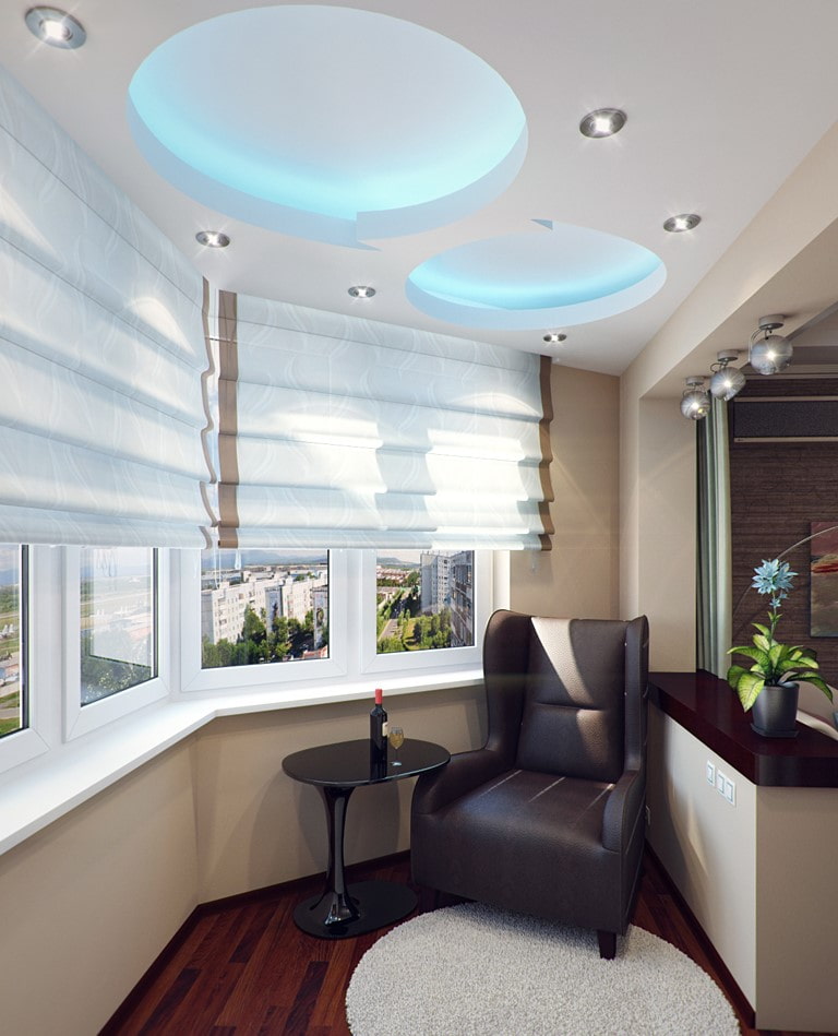 The ceiling on the balcony provides an opportunity to turn this space into a functional, cozy and comfortable room. Various interesting ceiling designs, in combination with lighting, allow you to make a full-fledged room from a loggia.