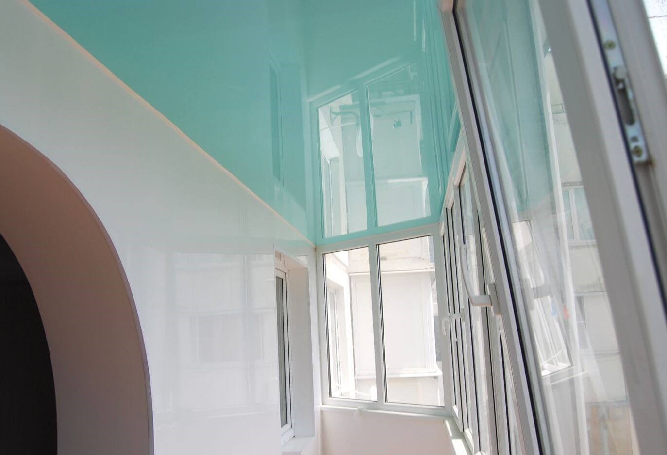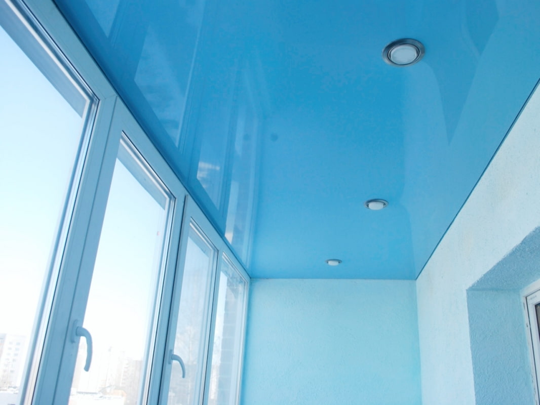 In the photo there is a balcony in light colors and a white ceiling with a matte texture.