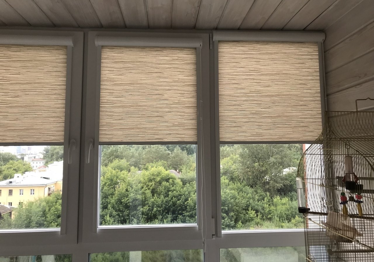 Add tenderness and comfort to the balcony space. Beige roller blinds noticeably refresh the room and make it much lighter.