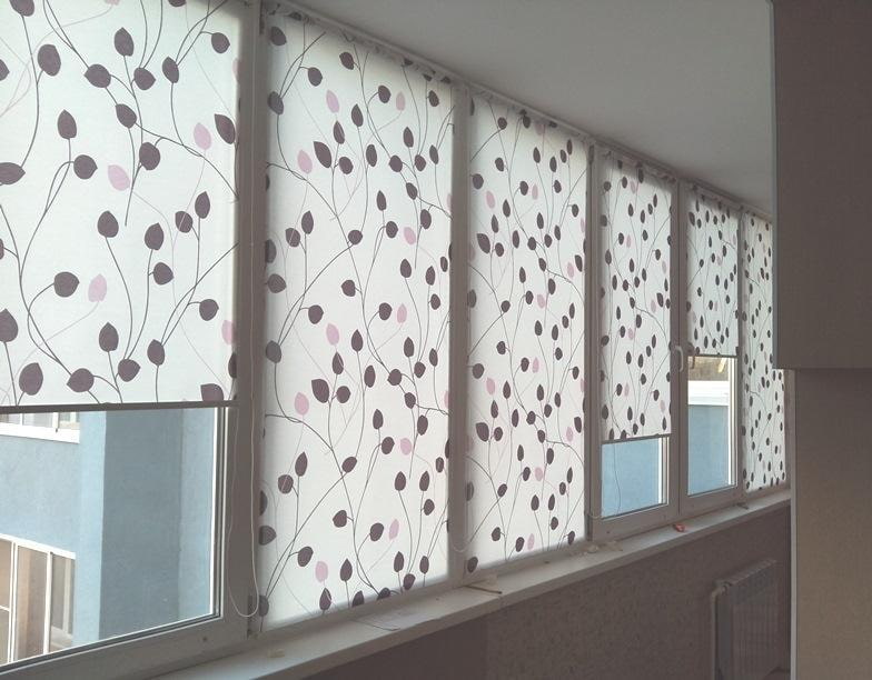 In the photo there is a balcony and beige roller blinds decorated with floral designs.