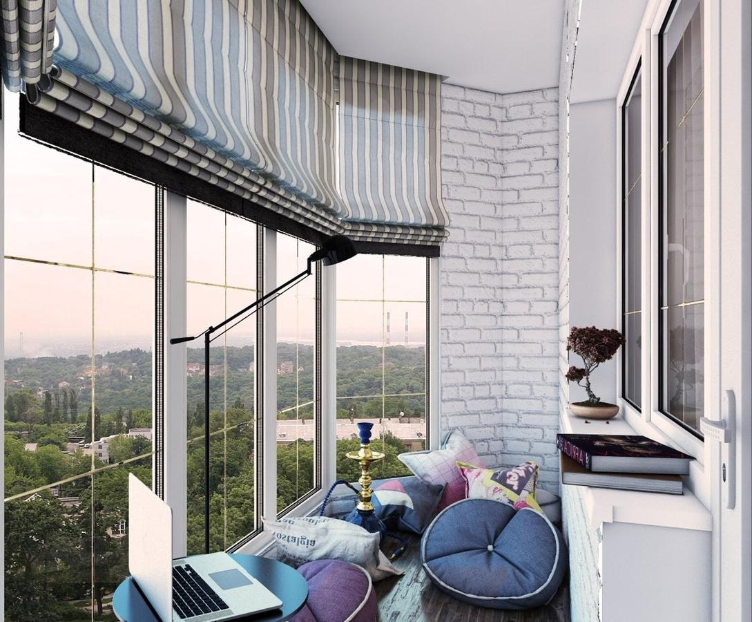 In the photo there are windows with Austrian curtains in the interior of the balcony.