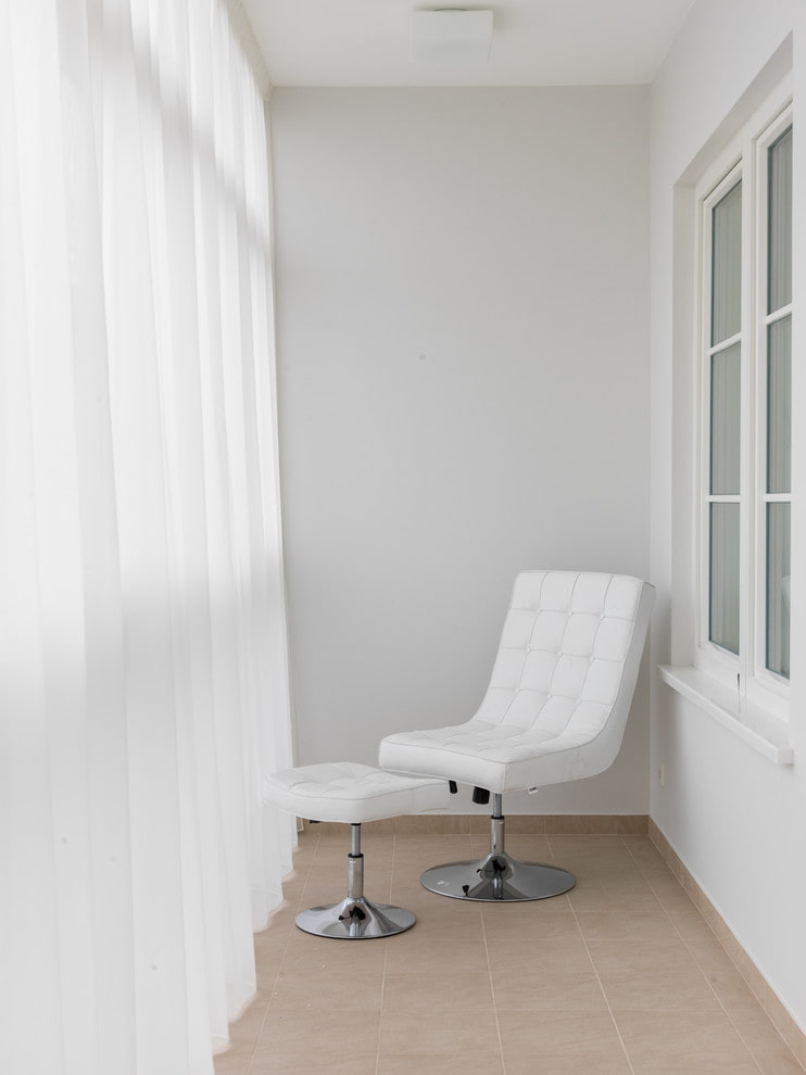 The photo shows the interior of the balcony and weightless white curtains on the windows.