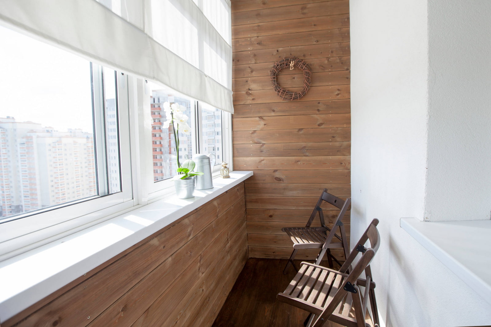 In the photo there is a loggia, in the decoration of which processed boards and white paint are harmoniously combined.