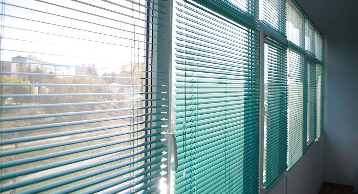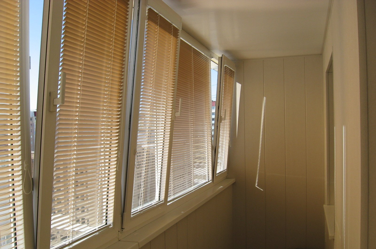 In the photo there is a loggia with horizontal slats on the sliding windows.