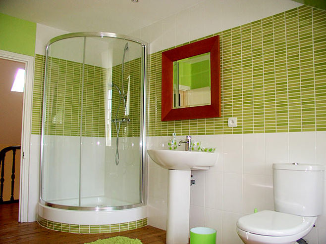 A more effective solution to create green bathroom design will replace the usual white washbasin and bathtub with green counterparts. Such a bold step will be appreciated and will be repeated by many.