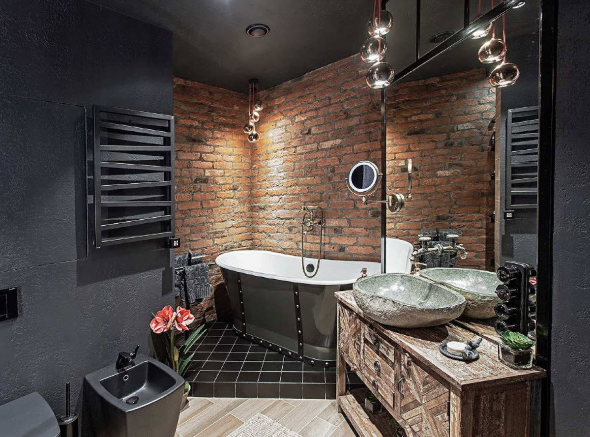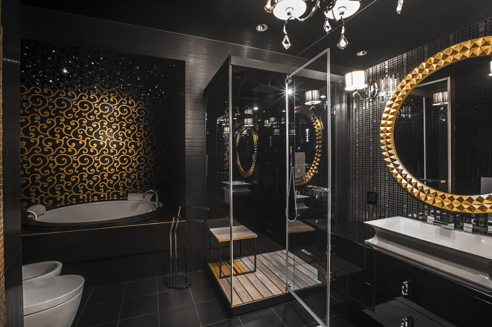 Metal. A win-win combination - with copper, bronze, gold, platinum, silver. Considering photos of black bathrooms, pay attention to plumbing: replacing classic chrome with bronze you will get an interesting effect.
