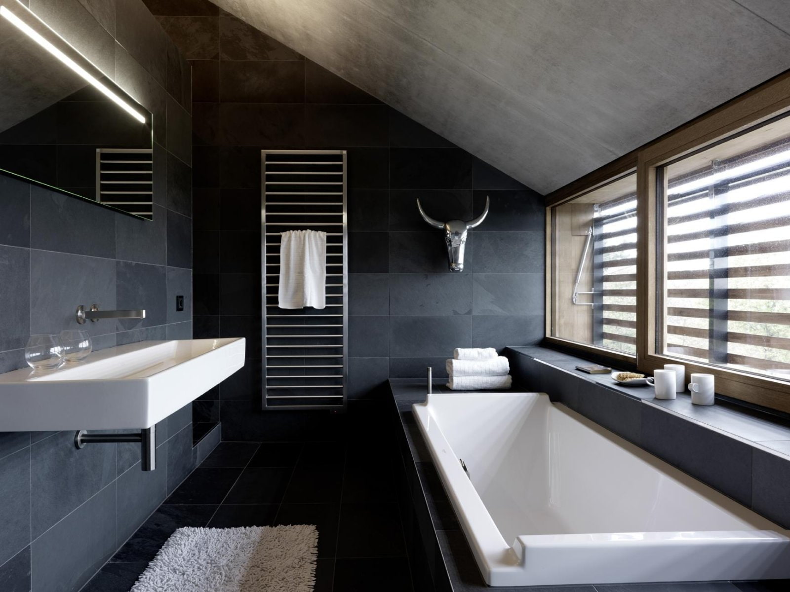 Floor. Rely not only on appearance, but also on practicality. Mold will appear under linoleum in conditions of high humidity, and the laminate will simply swell. The best option is tiles or masonry. The roughness of black tiles is softened by a soft fluffy rug. Lay exclusively matte tiles on the floor, it does not slip and gets dirty less.