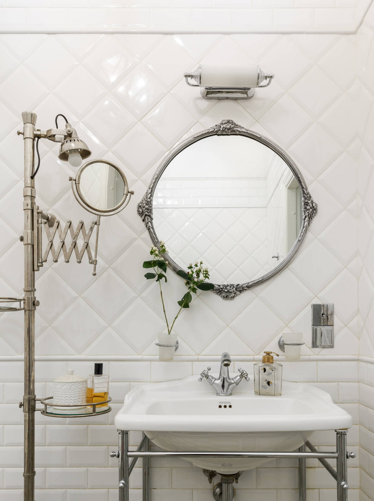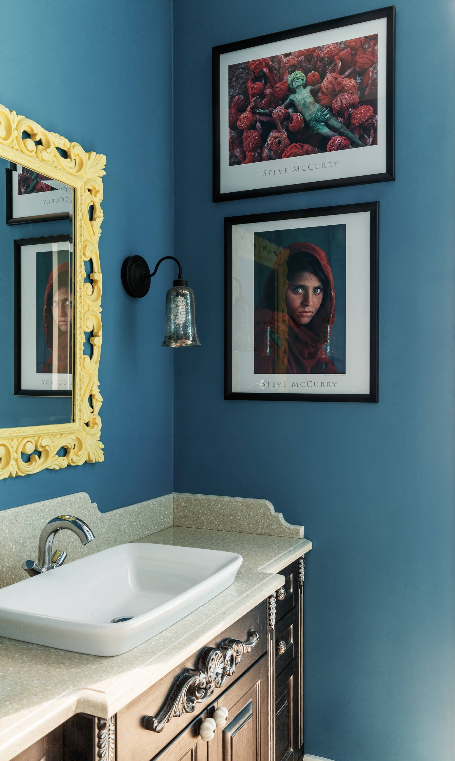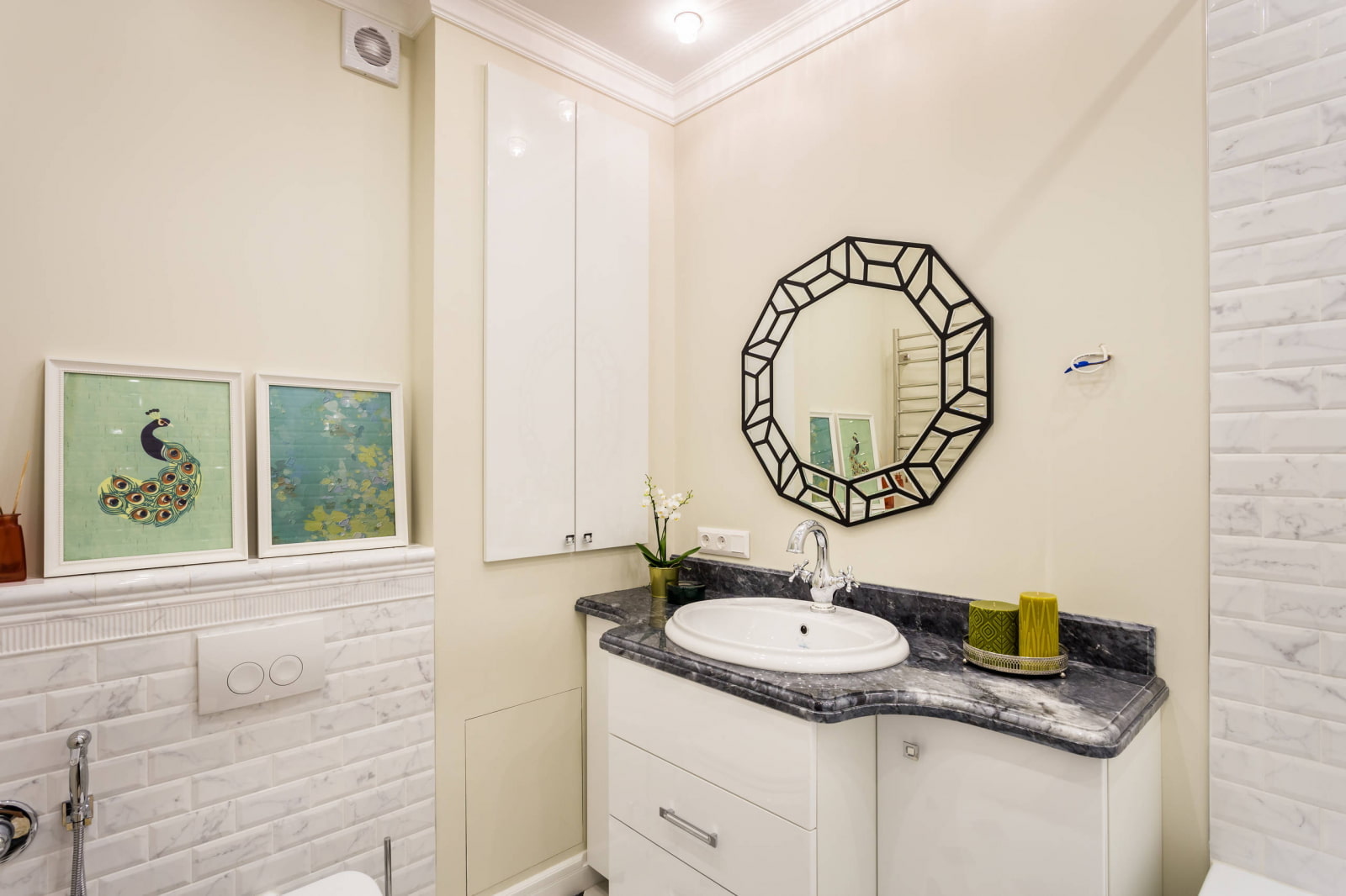In the photo there is a bathroom in the style of a modern classic with a decor in the form of a mirror with an original frame and paintings.