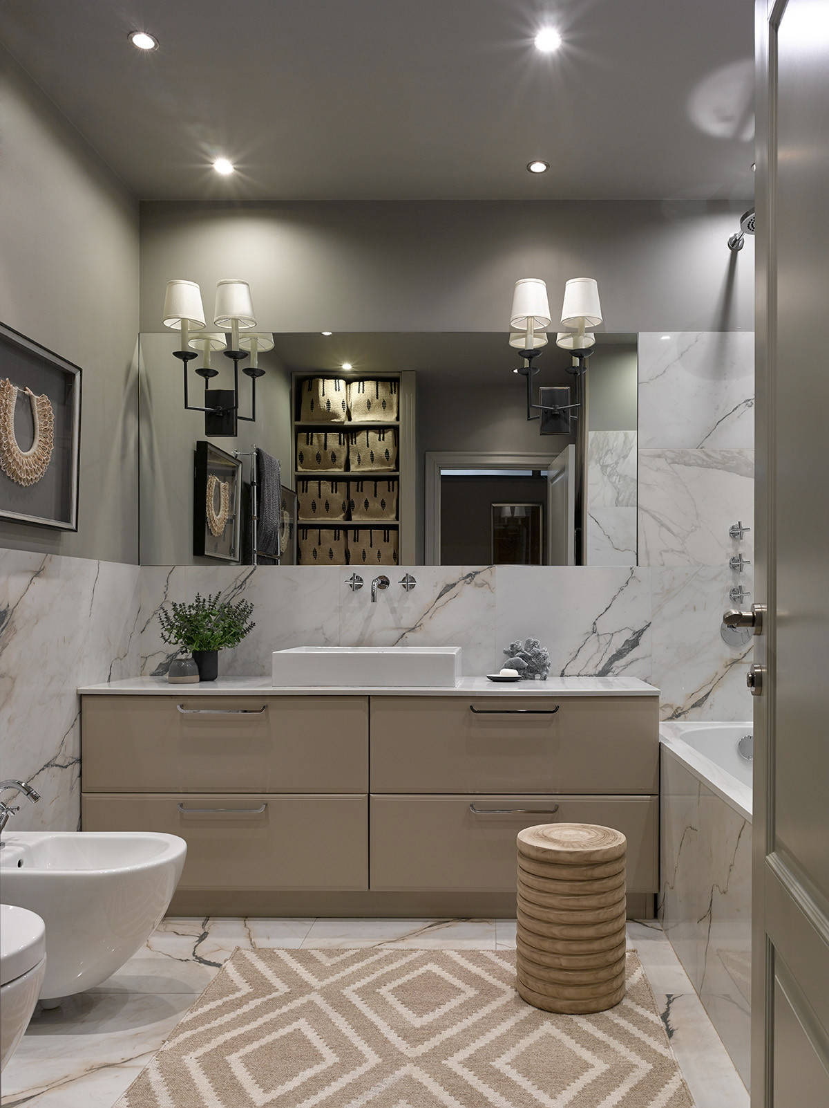 If you don't want to overload the laconic bathroom with details, it is enough to replace the standard handles with more original ones. This solution will make the bathroom look more interesting and more expensive.